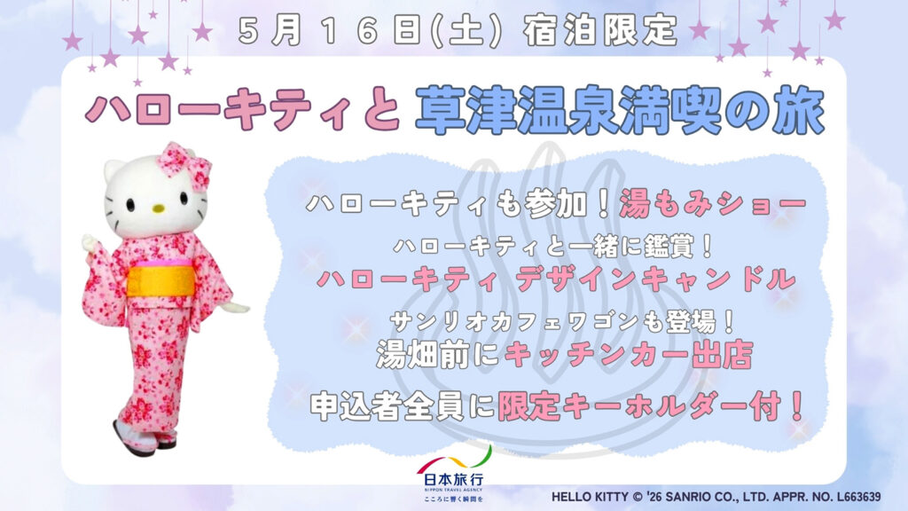 当日は、ハローキティと一緒に楽しめる特別イベントや、草津温泉ならではの魅力を体験できる企画をご用意しております。